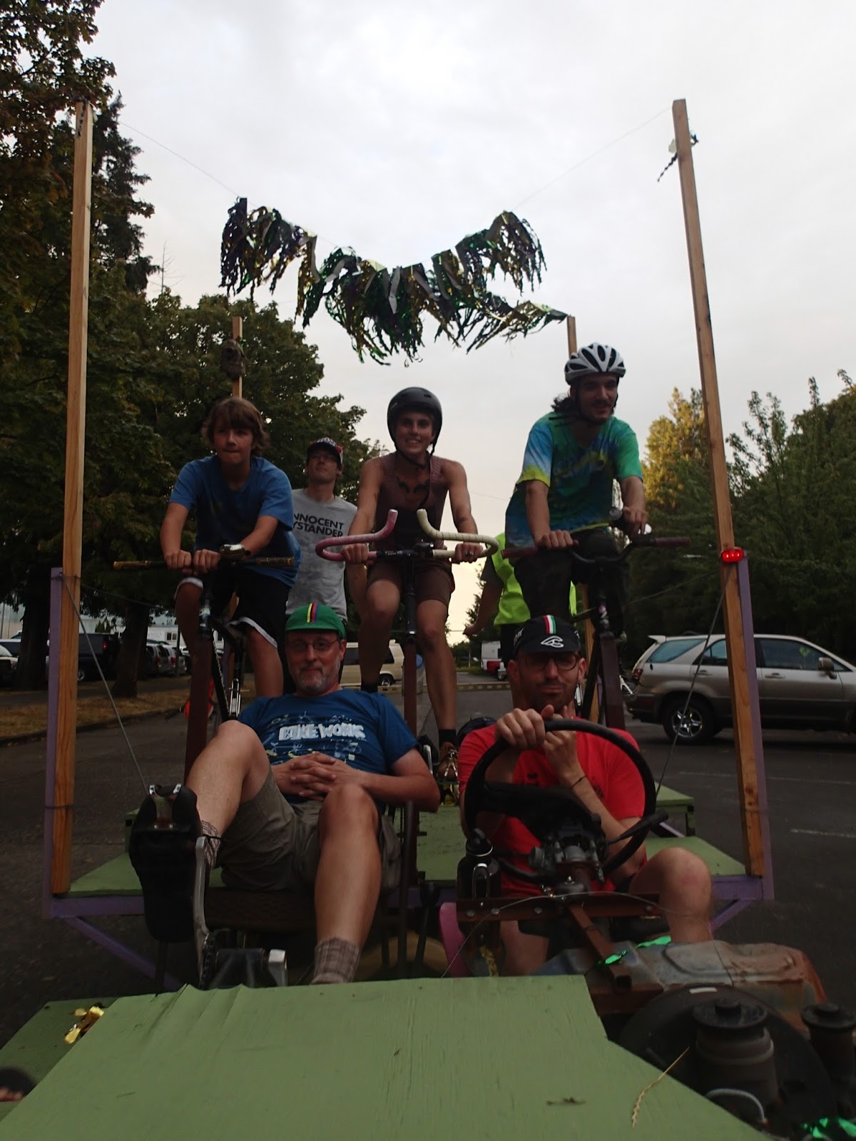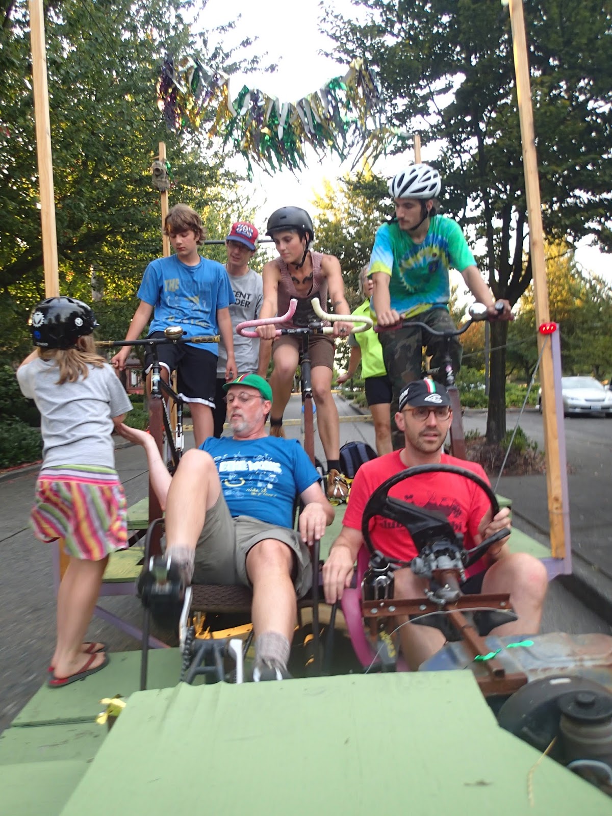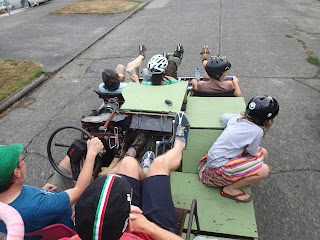 I began the ride on one of the three upright pedal stations at the rear of the Octobike, but switched to the center of the three forward recumbent spots for the last half of the ride. On the Octobike seven people pedal while one person steers, shifts and works the brakes. It's pretty easy pedaling, slow going up hill but you can build up some serious speed going downhill. I was in the forward spot for the descent so I couldn't see the speedometer but I know we were going at least 30 mph down Columbian Way.